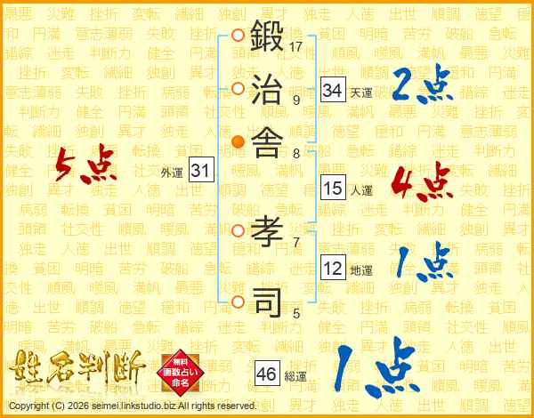 鍛(17画)治(9画)舎(8画) 孝(7画)司(5画)