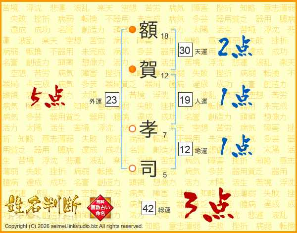 あなたの人生を表す1番重要な運勢です。生涯を通じて影響する総合運となり、主に50歳以降の晩年期に影響を及ぼします。苗字と名前の合計画数。