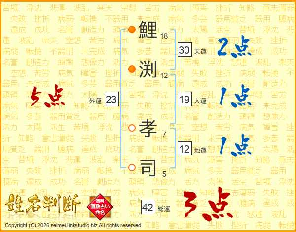 鯉(18画)渕(12画) 孝(7画)司(5画)