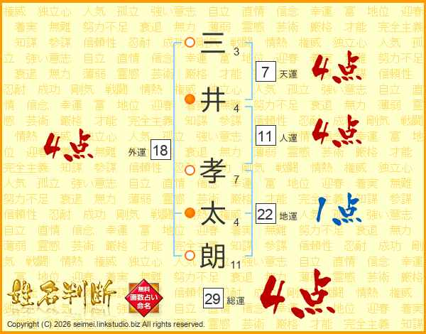 三井孝太朗さんの人運は11画の4点!