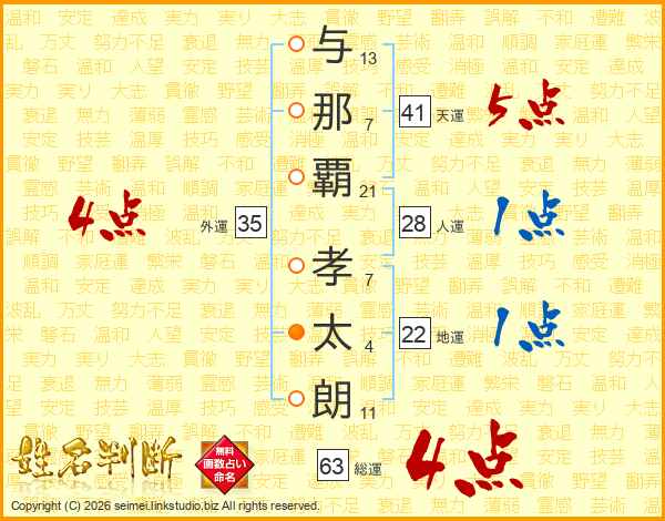 与(13画)那(7画)覇(21画) 孝(7画)太(4画)朗(11画)