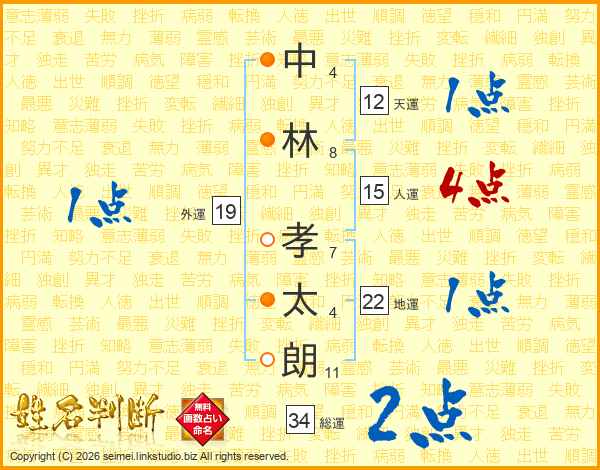 中(4画)林(8画) 孝(7画)太(4画)朗(11画)