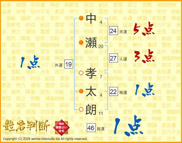 中(4画)瀬(20画) 孝(7画)太(4画)朗(11画)