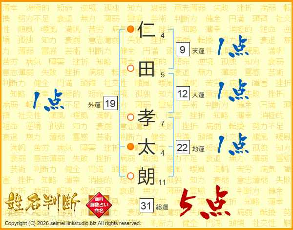 仁(4画)田(5画) 孝(7画)太(4画)朗(11画)