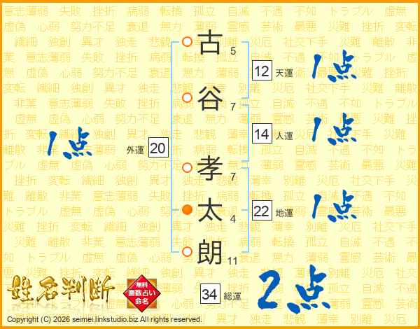 古(5画)谷(7画) 孝(7画)太(4画)朗(11画)