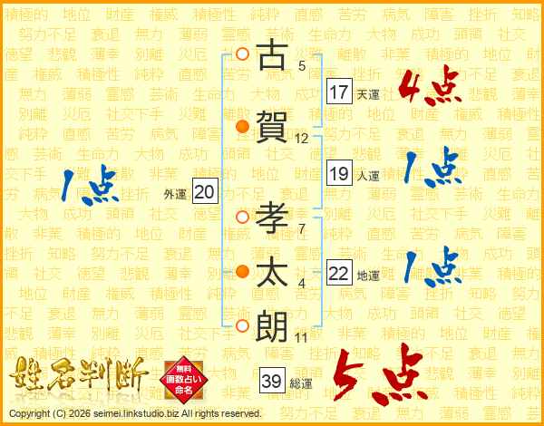 古(5画)賀(12画) 孝(7画)太(4画)朗(11画)