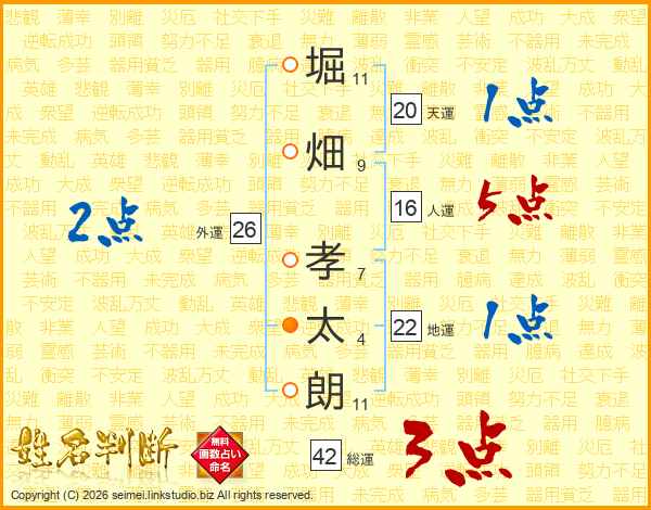 堀(11画)畑(9画) 孝(7画)太(4画)朗(11画)