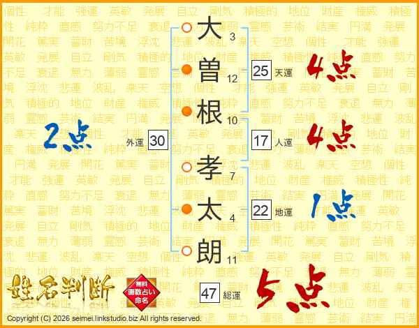 大(3画)曽(12画)根(10画) 孝(7画)太(4画)朗(11画)