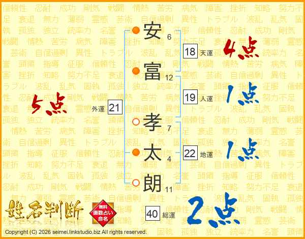 安(6画)富(12画) 孝(7画)太(4画)朗(11画)