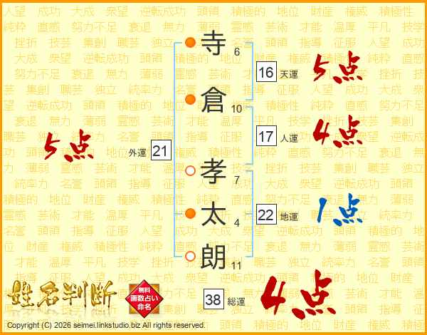 寺(6画)倉(10画) 孝(7画)太(4画)朗(11画)