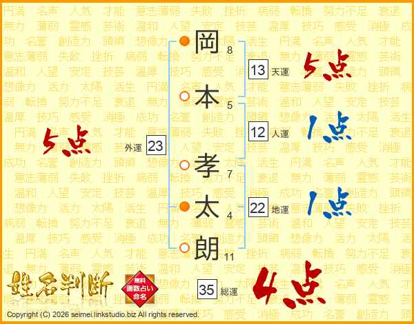 岡(8画)本(5画) 孝(7画)太(4画)朗(11画)