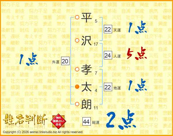 平(5画)沢(17画) 孝(7画)太(4画)朗(11画)