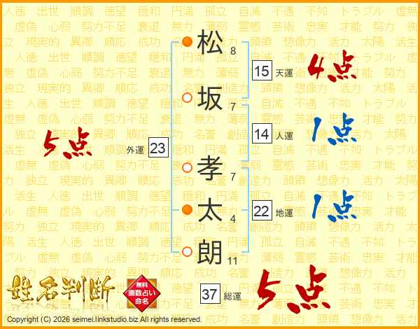 松(8画)坂(7画) 孝(7画)太(4画)朗(11画)