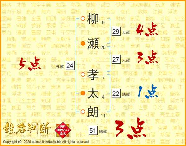 柳(9画)瀬(20画) 孝(7画)太(4画)朗(11画)