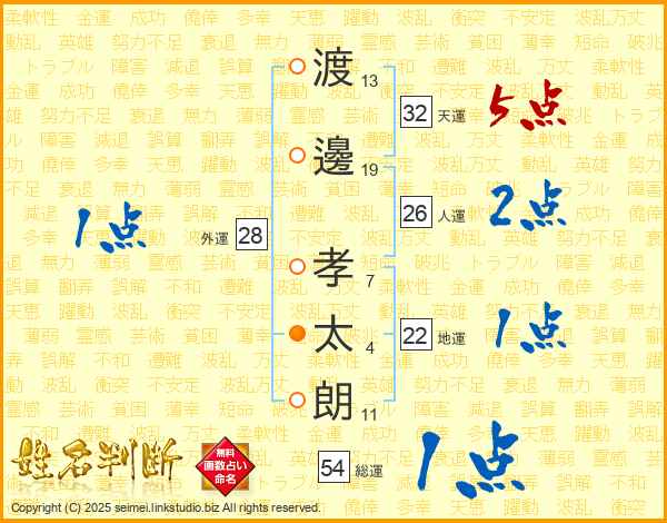 渡(13画)邊(19画) 孝(7画)太(4画)朗(11画)