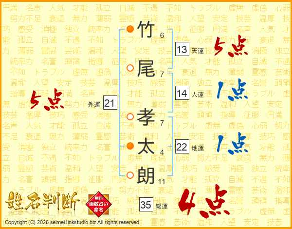 竹(6画)尾(7画) 孝(7画)太(4画)朗(11画)