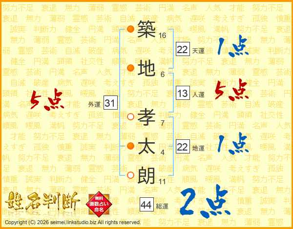 築地孝太朗さんの総運は44画の2点!