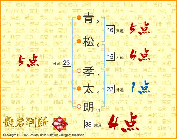 青(8画)松(8画) 孝(7画)太(4画)朗(11画)