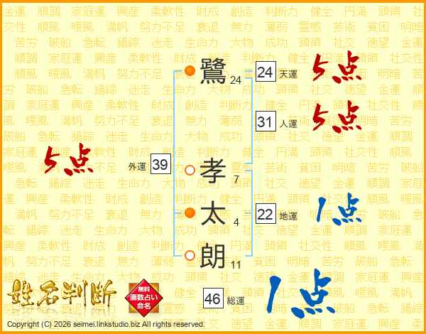 鷺(24画) 孝(7画)太(4画)朗(11画)