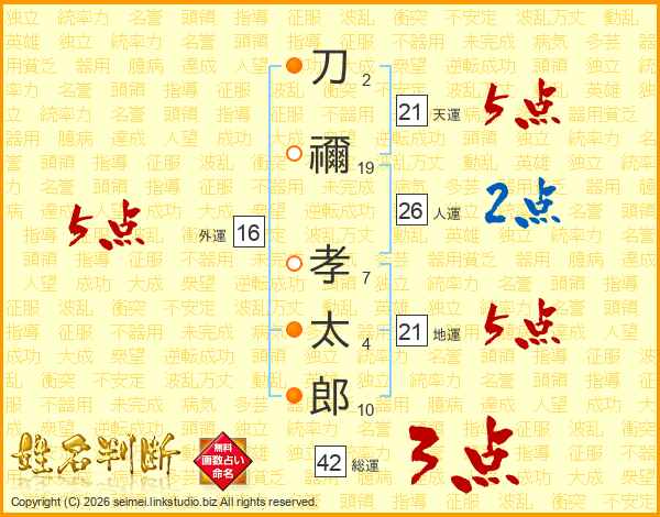 刀禰孝太郎さんの天運は21画の5点!