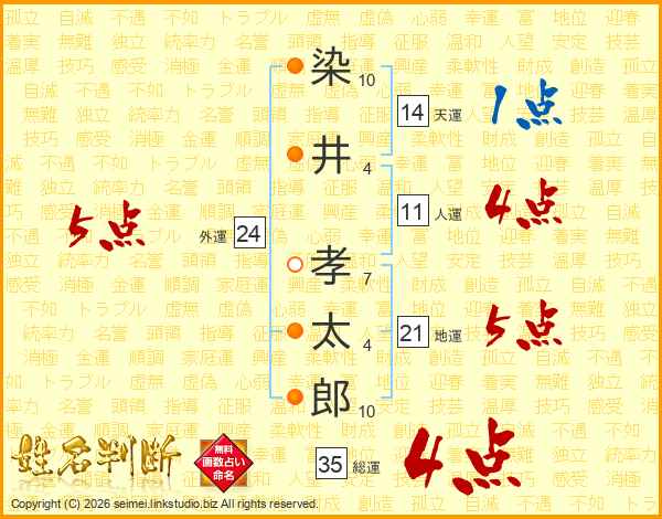 染(10画)井(4画) 孝(7画)太(4画)郎(10画)