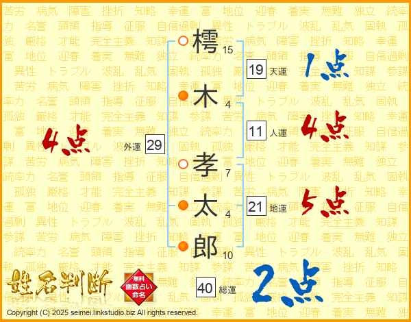 樗(15画)木(4画) 孝(7画)太(4画)郎(10画)