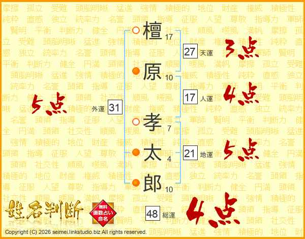 檀(17画)原(10画) 孝(7画)太(4画)郎(10画)
