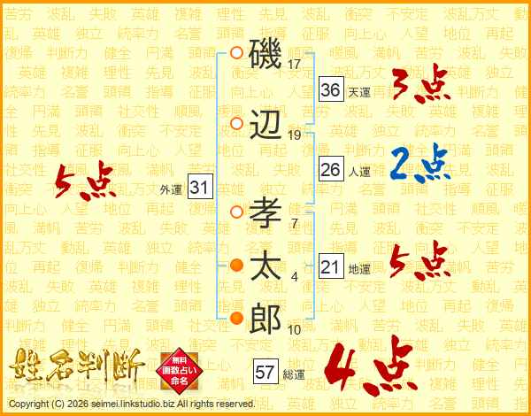 磯(17画)辺(19画) 孝(7画)太(4画)郎(10画)