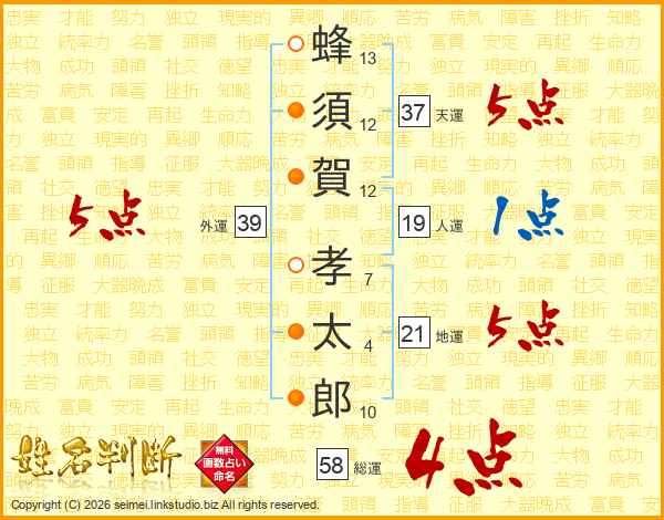 蜂(13画)須(12画)賀(12画) 孝(7画)太(4画)郎(10画)