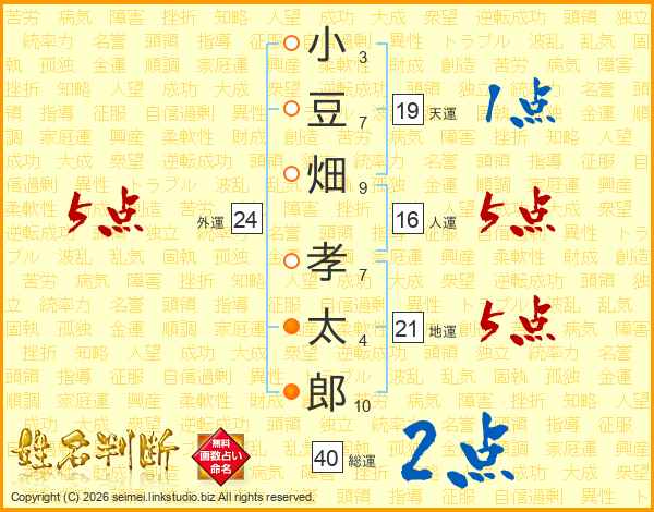 小(3画)豆(7画)畑(9画) 孝(7画)太(4画)郎(10画)