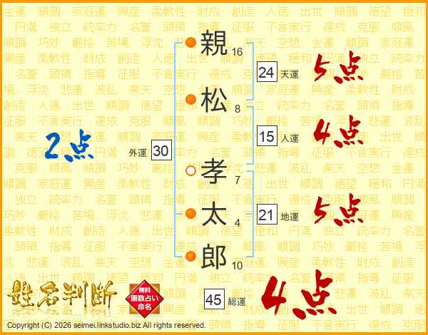 親(16画)松(8画) 孝(7画)太(4画)郎(10画)