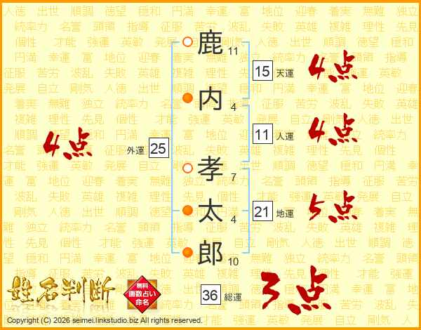 鹿(11画)内(4画) 孝(7画)太(4画)郎(10画)
