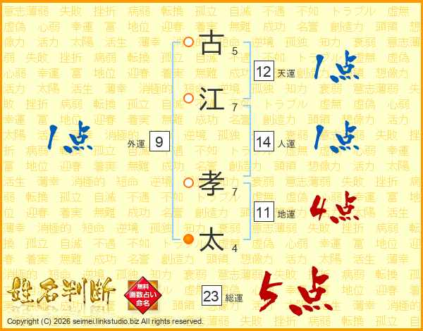 画数の奇数(○陽)と偶数(●陰)の配列で吉凶を占います。どちらかにかたよる名前は大凶名で避ける必要があります。画数の奇数偶数。
