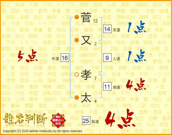 菅(12画)又(2画) 孝(7画)太(4画)