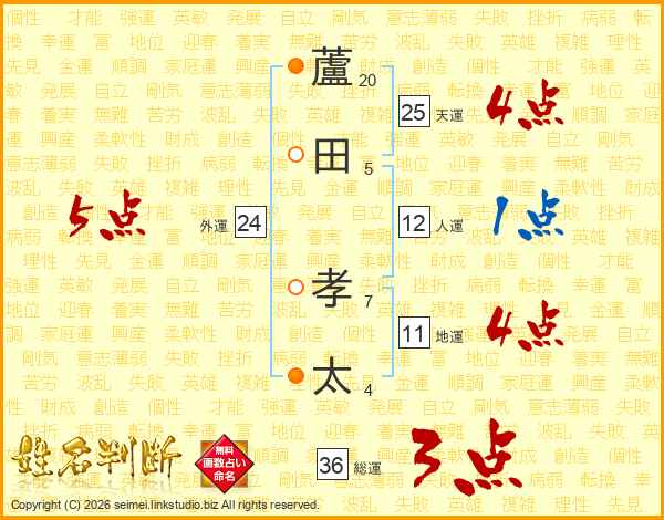 蘆(20画)田(5画) 孝(7画)太(4画)