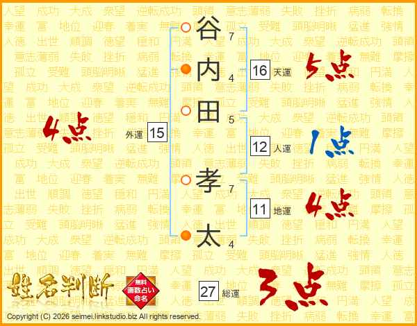 谷(7画)内(4画)田(5画) 孝(7画)太(4画)