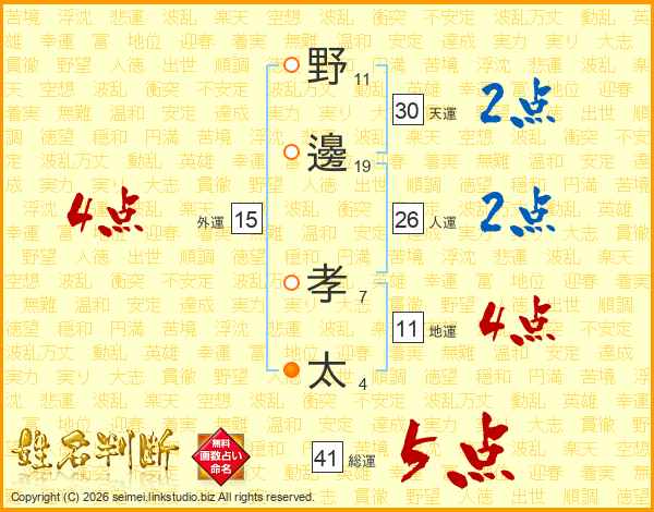 生活面を象徴する運勢です。外部から受ける影響力を表し、結婚運、家庭運や職場、環境への順応性を表します。総運から人運を引いた画数。姓や名が1文字の場合を除く。