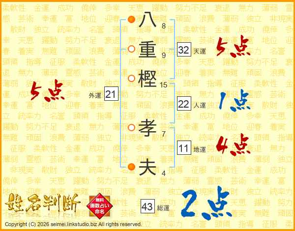 八(8画)重(9画)樫(15画) 孝(7画)夫(4画)