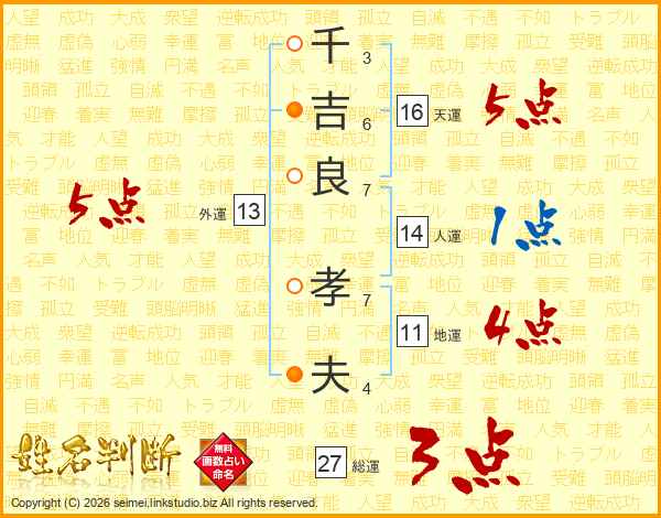 千(3画)吉(6画)良(7画) 孝(7画)夫(4画)