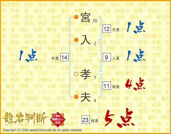 宮(10画)入(2画) 孝(7画)夫(4画)
