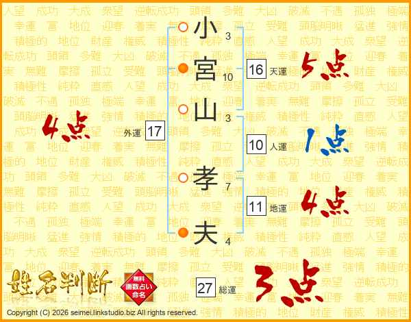 小(3画)宮(10画)山(3画) 孝(7画)夫(4画)