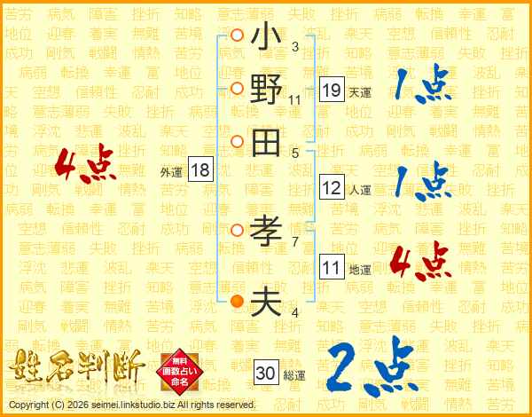小野田孝夫さんの総運は30画の2点!