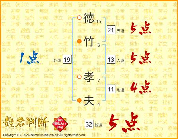 徳(15画)竹(6画) 孝(7画)夫(4画)