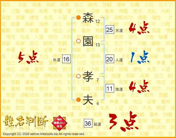 あなたの人生を表す1番重要な運勢です。生涯を通じて影響する総合運となり、主に50歳以降の晩年期に影響を及ぼします。苗字と名前の合計画数。
