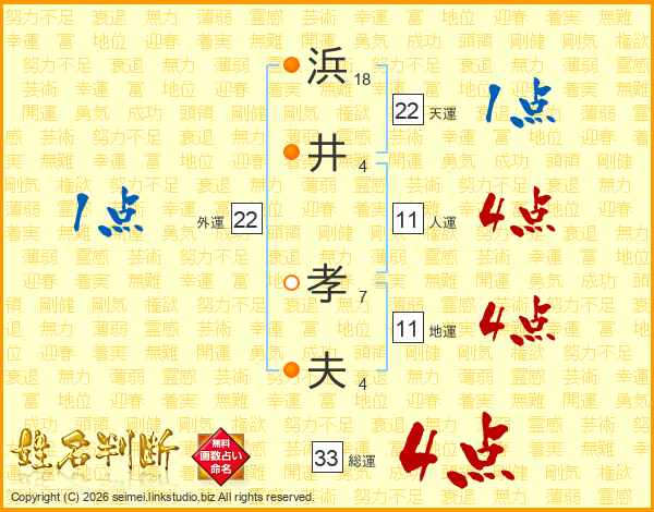 浜(18画)井(4画) 孝(7画)夫(4画)