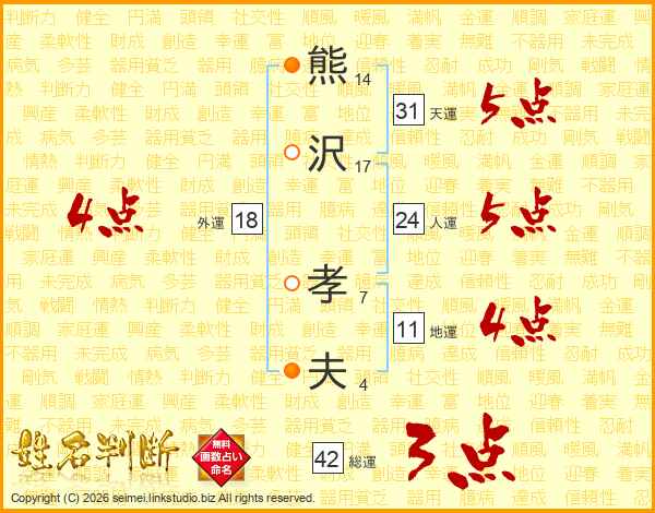 熊(14画)沢(17画) 孝(7画)夫(4画)