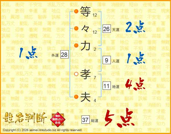 等(12画)々(12画)力(2画) 孝(7画)夫(4画)