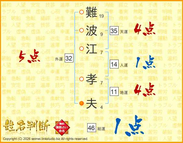 難(19画)波(9画)江(7画) 孝(7画)夫(4画)