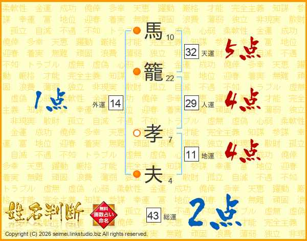 馬(10画)籠(22画) 孝(7画)夫(4画)