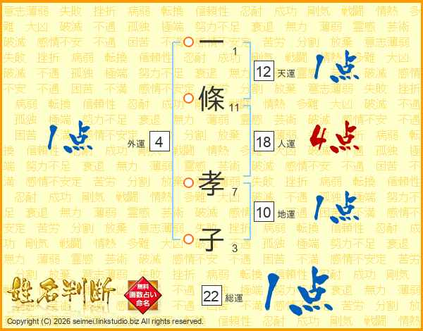 あなたの人生を表す1番重要な運勢です。生涯を通じて影響する総合運となり、主に50歳以降の晩年期に影響を及ぼします。苗字と名前の合計画数。